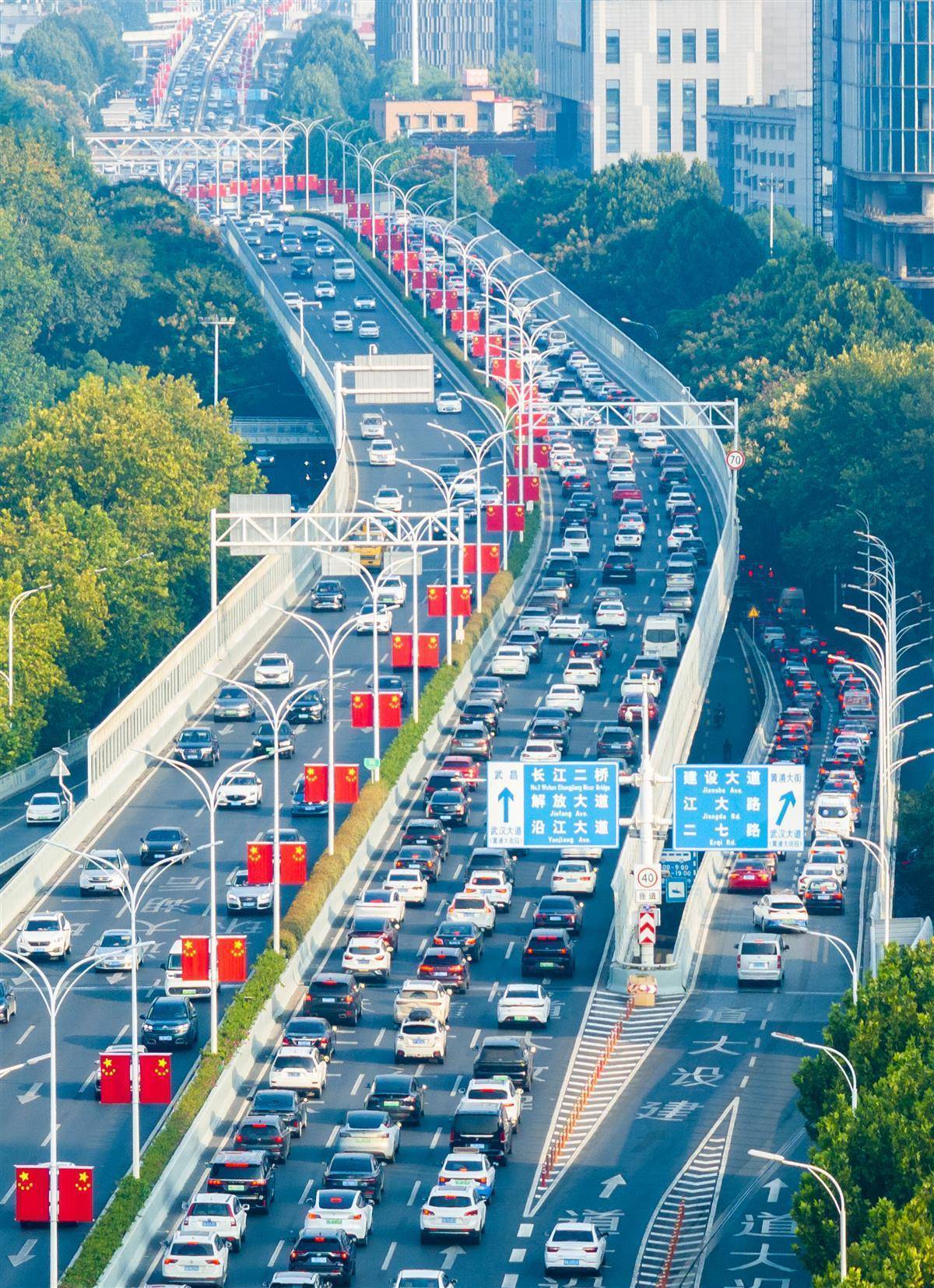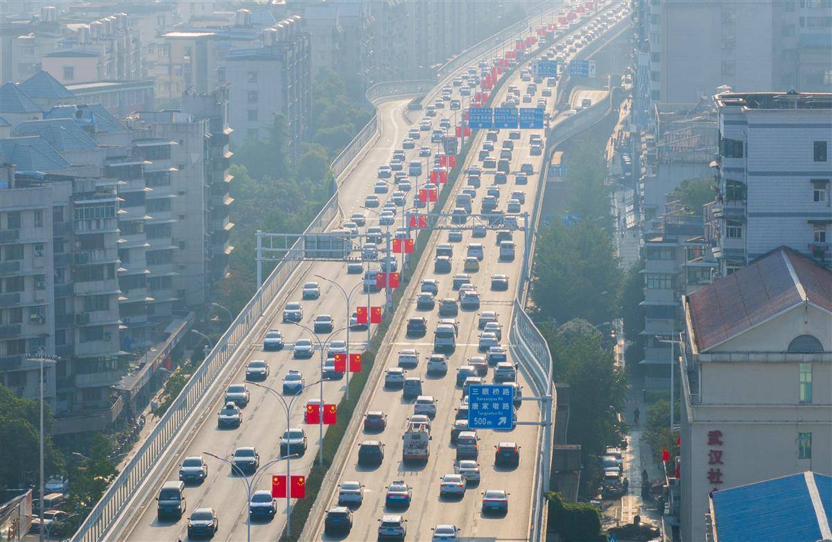 10月8日,国庆假期最后一天,武汉迎来返程车流高峰。下午4时许,武汉市内各主干道车流量明显增大。(湖北日报全媒记者 柯皓 摄)